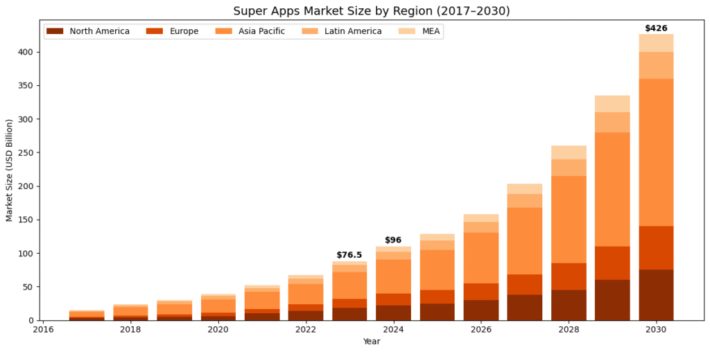 The UAE operates within the fast-growing Middle East and Africa super app market, which Grand View Research projects to grow at a 28.3% CAGR through 2030. Globally, the super app market was valued at USD 76.5 billion in 2023 and is expected to reach USD 426 billion by 2030.
