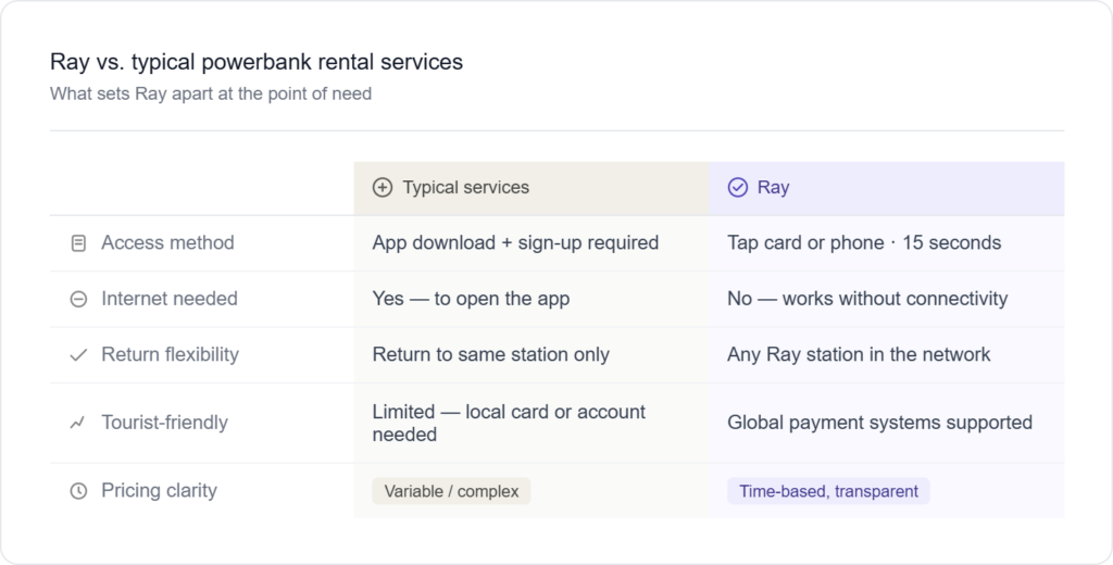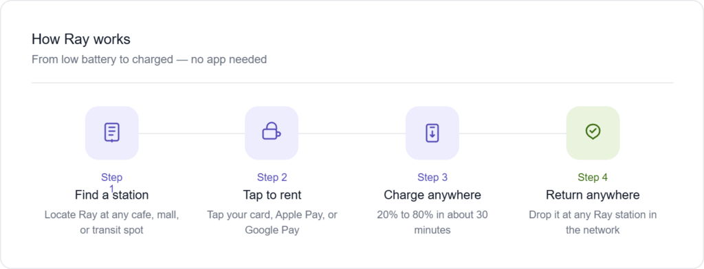 The value becomes clear in real moments. When someone is navigating, making payments, or waiting for a ride, a dead phone creates friction. Ray positions itself as the fastest way to remove that friction without changing user behavior.