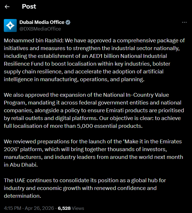 Mohammed bin Rashid Al Maktoum announced the initiative as part of a broader national strategy to build a more resilient and self-sufficient industrial ecosystem. The fund will support the localization of more than 5,000 essential products while expanding the National In-Country Value Programme across federal entities and national companies.